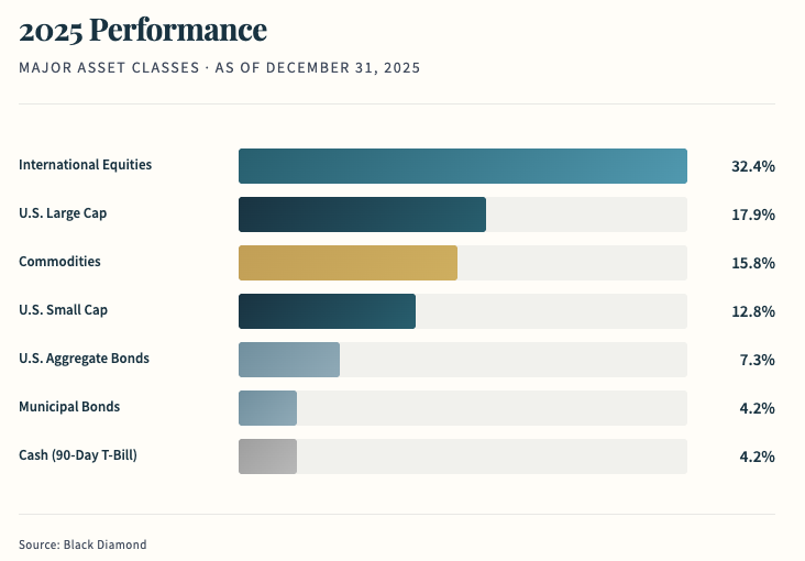 2025 finally reminded us why we diversify. International stocks outperformed U.S. markets by the widest margin in more than three decades. Bonds generated real income again. Gold had a remarkable year outperforming all major asset classes. And the principles we’ve built portfolios around—balance, valuation discipline, and broad diversification—were rewarded in ways they haven’t been for some time.
